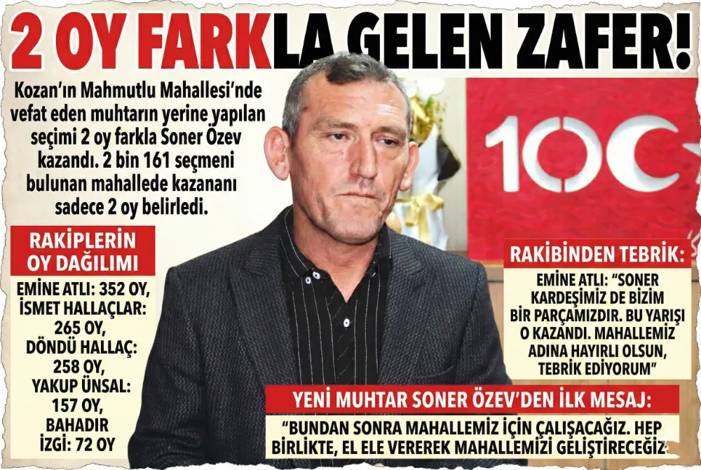 Resmi olmayan sonuçlara göre, muhtarlık yarışını 354 oy alan Soner Özev önde tamamladı. Özev’in en yakın rakibi olan Emine Atlı ise 352 oyda kaldı. Sadece 2 oy gibi kritik bir farkla muhtar seçilen Soner Özev, mahallenin yeni temsilcisi oldu. Seçime katılan diğer adaylar arasındaki oy dağılımı ise şu şekilde gerçekleşti: İsmet Hallaçlar 265 oy, Döndü Hallaç 258 oy, Yakup Ünsal 157 oy ve Bahadır İzgi ise 72 oy aldı.