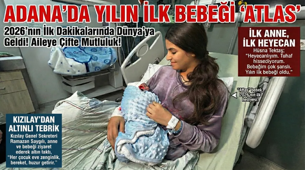 Adana'da yeni yılın ilk bebeği "Atlas" oldu. Hüsna Tektaş, 2026'nın ilk dakikalarında sezaryen doğumla sağlıklı bir erkek bebek dünyaya getirdi. Aileyi sevince boğan doğumun ardından Türk Kızılay Genel Sekreteri Ramazan Saygılı, anne ve bebeği hastanede ziyaret etti.