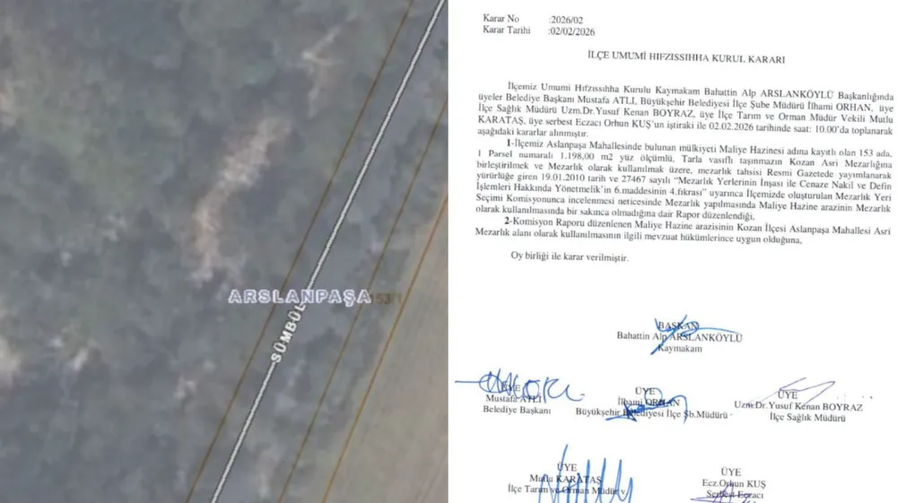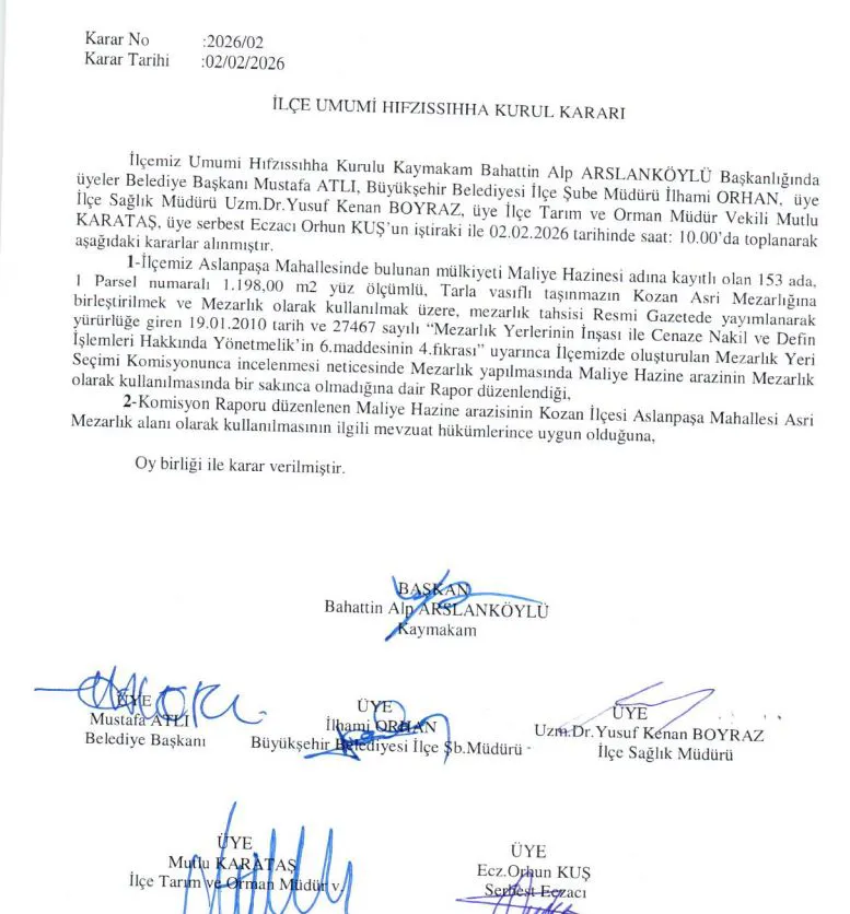Kurulda, Aslanpaşa Mahallesi’nde Mali Hazine adına kayıtlı 153 ada 1 parsel numaralı, 1.198 metrekarelik tarla vasıflı taşınmaz ele alındı. Burası mezarlığın doğu cephesindeki boş tarlanın bir kısmını kapsıyor. Mezarlık Yeri Seçim Komisyonu tarafından yapılan incelemede, söz konusu alanın Kozan Asri Mezarlığına birleştirilerek mezarlık olarak kullanılmasında sakınca olmadığı yönünde rapor hazırlandığı belirtildi.