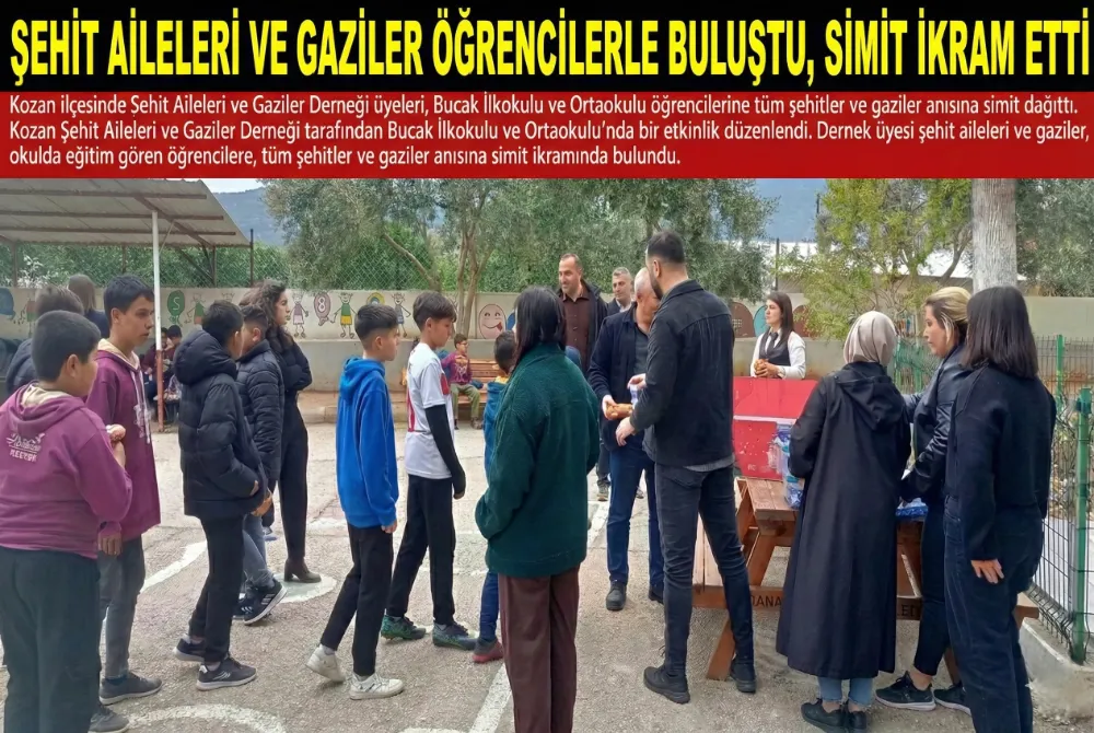 Kozan Şehit Aileleri ve Gaziler Derneği tarafından Bucak İlkokulu ve Ortaokulu'nda bir etkinlik düzenlendi. Dernek üyesi şehit aileleri ve gaziler, okulda eğitim gören öğrencilere, tüm şehitler ve gaziler anısına simit ikramında bulundu.